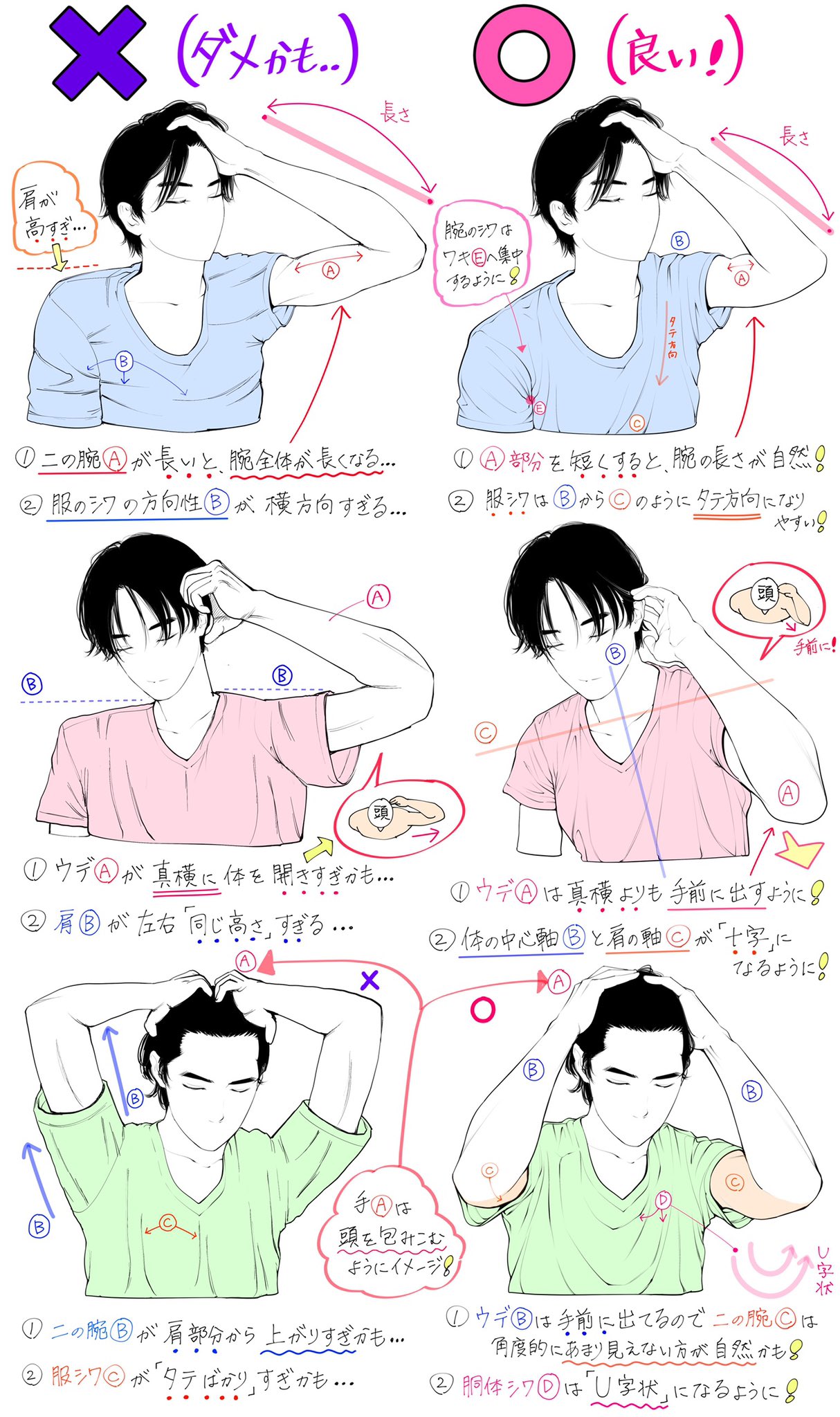 吉村拓也 イラスト講座 On Twitter 髪かきあげるポーズの描き方 かきあげる腕と体の向き が上達するための ダメなこと と 良いこと 全12パターンの比較解説です